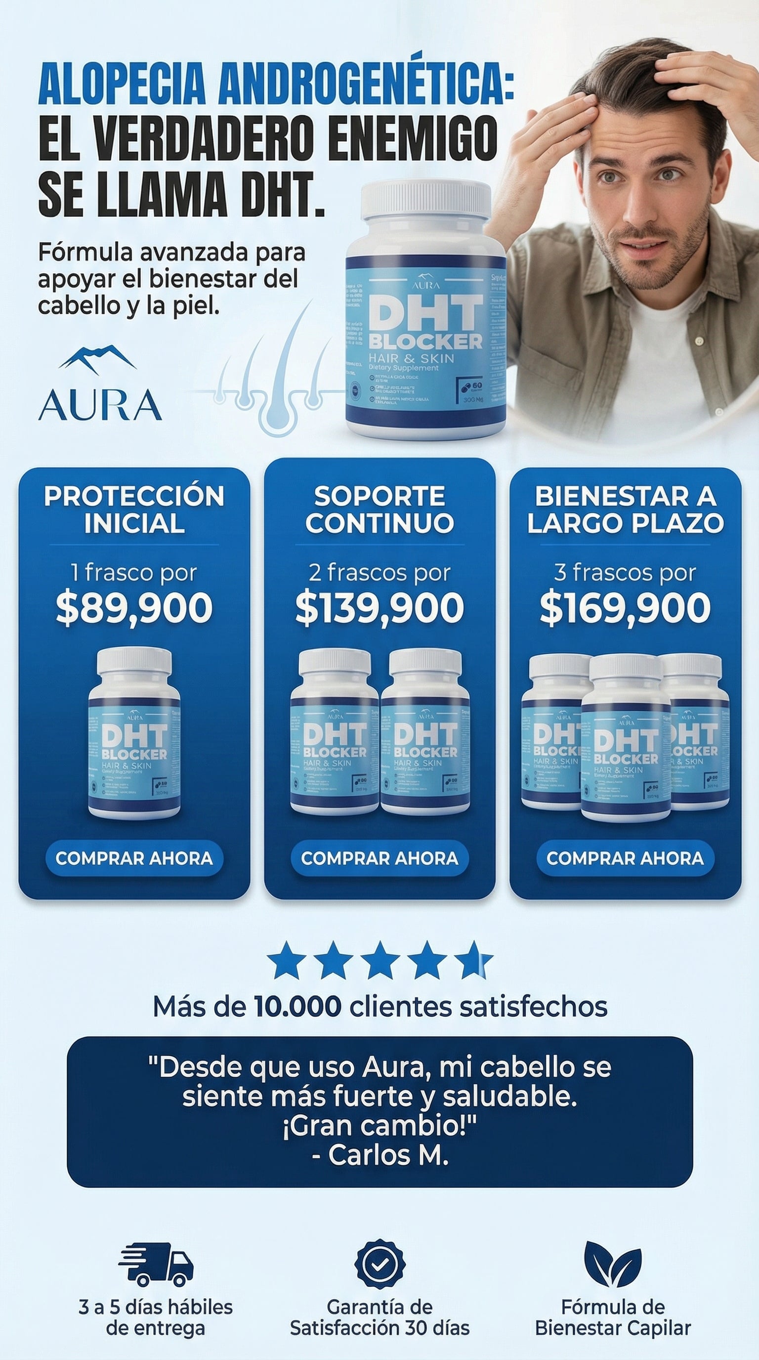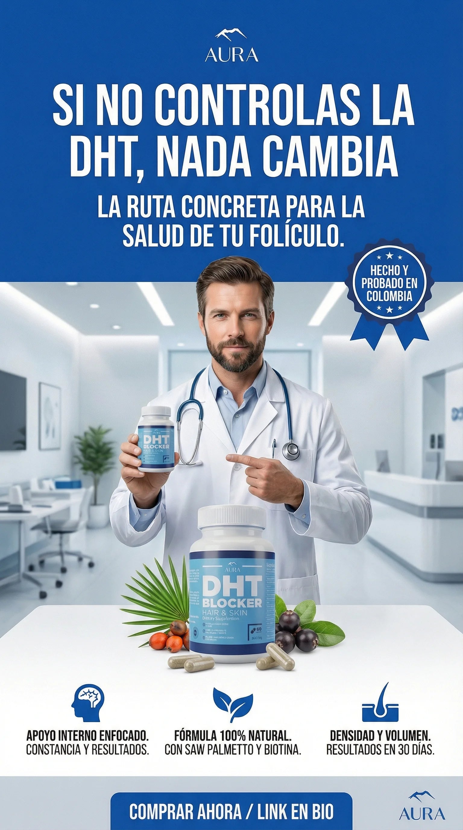 La DHT (dihidrotestosterona) es un derivado de la testosterona. En personas con predisposición genética, la sensibilidad a la DHT puede contribuir a que el folículo se vaya debilitando con el tiempo, afectando el grosor y la densidad del cabello.